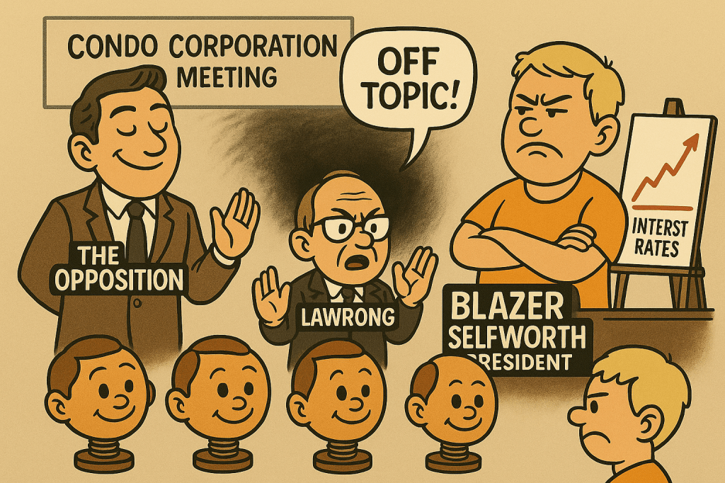 Off-topic? In a general meeting about the state of the community? Apparently, in Blazer Selfworth’s Condo Kingdom, the only acceptable âtopicsâ are scripted brilliance from the legal department, delivered by a human teleprompter who couldn’t possibly explain what he just said – but rest assured, he read it slowly and with confidence. Not the whole hundreds of thousands of dollars losing in court again thing.