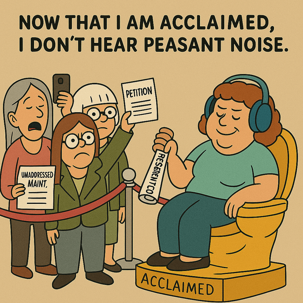 But fear not, dear reader. Here at The Condo Tribune, we do not begrudge her the acclamation. After all, some are born great, some achieve greatness, and some have greatness thrust upon them by a default clause in Robert’s Rules of Order.
