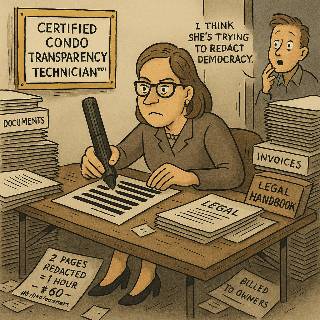 But welcome to the wondrous world of condo governance, where time bends, logic dies, and apparently it takes a full hour to censor two pages of a lawyer’s invoice – and yes, they’ll be billing you for that $60/hour redaction extravaganza.
