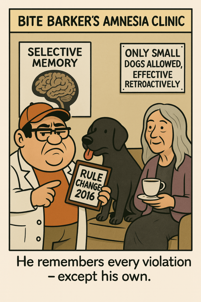 Suddenly, he’s the Enforcer of the Sacred Scroll, conveniently forgetting the very rule that once made his own dog legal.