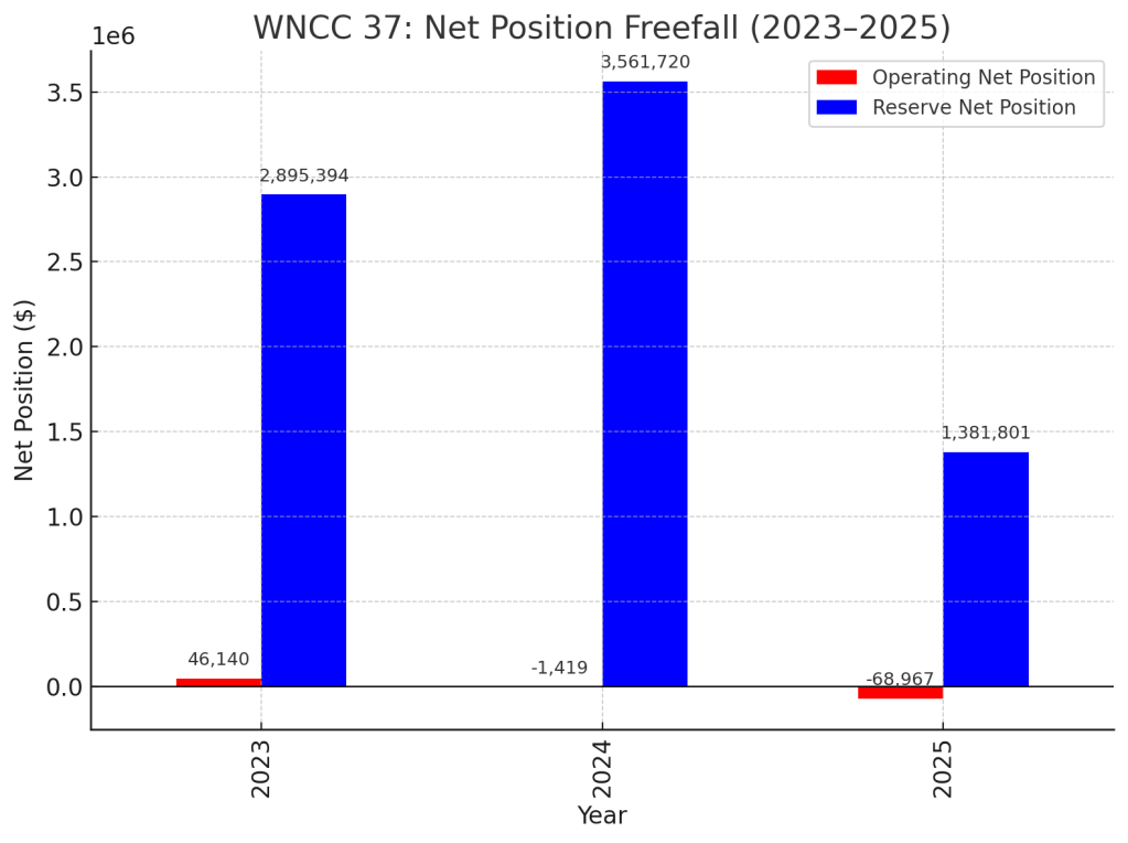 - The red bars (operating fund net position) in the chart drop from +$46K in 2023 to –$69K in 2025 – that’s a $115K swing in two years.