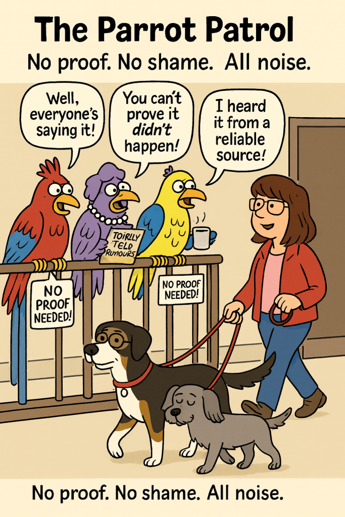 And then there’s our very own flock – the self-appointed Parrot Patrol – whose only act of service is repeating the same tired lies about my dogs, over and over, without a shred of proof.