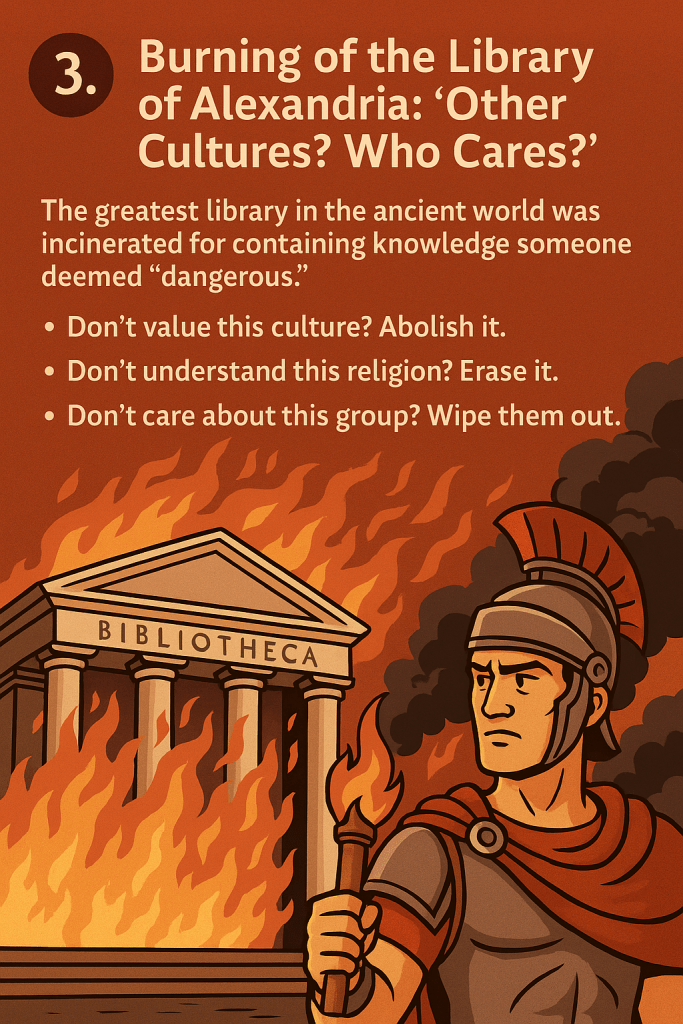 🎨 3. The Library of Alexandria: “If Knowledge Scares You, Burn It”