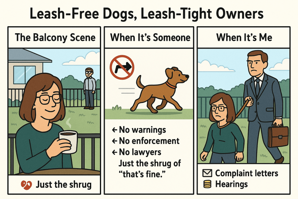 - 🐶 Dog unleashed in common areas → “Oh well.”