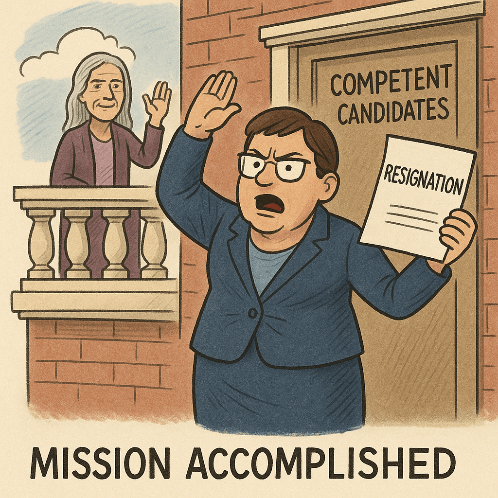 Forget governance, forget integrity – her true skill lies in strategic seating arrangements: making sure no one competent gets a seat at the table. She quit before she attended even one board meeting.
