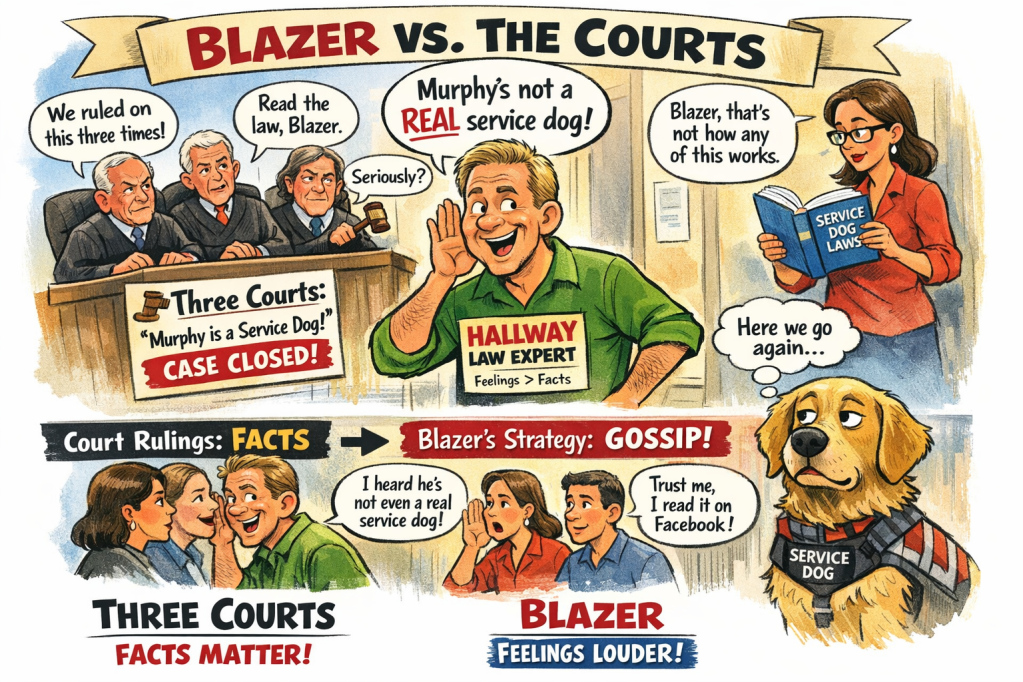 Apparently, Blazer has appointed himself Director of Canine Credential Verification, roaming the building to announce that Murphy – a trained service dog – is ājustā an emotional support animal.