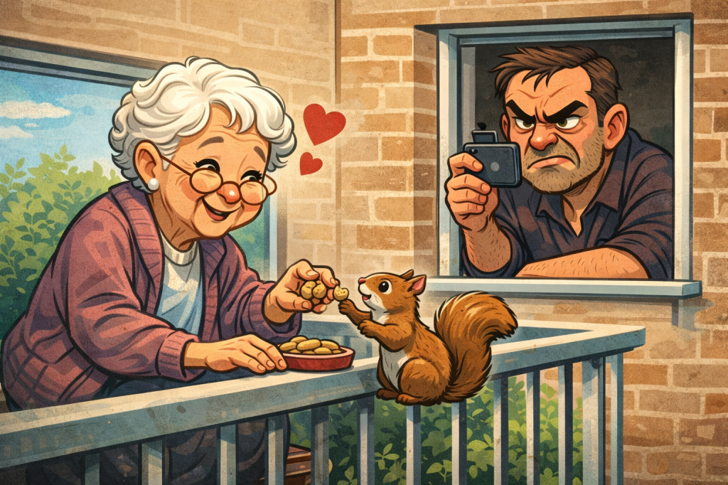 To the individual on the first floor who apparently spends their free time recording a lonely elderly woman feeding squirrels: