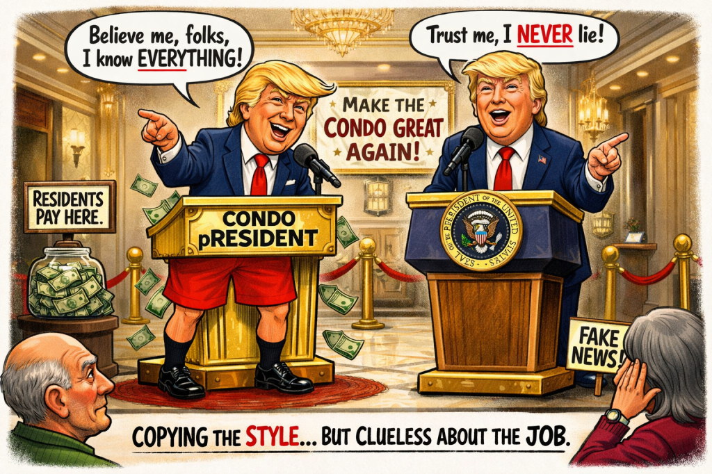 We hear – purely as neighborhood folklore, of course – that our buildingās pRESIDENT loves to impersonate Donald Trump.